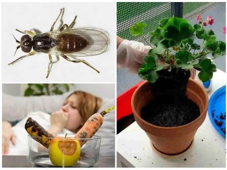 Цветочные черные мошки попадают в дом с цветочным грунтом и комнатными растениями. Среда их обитания – слишком влажная почва.